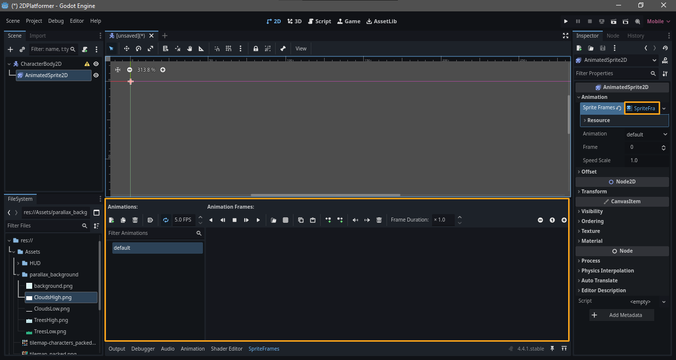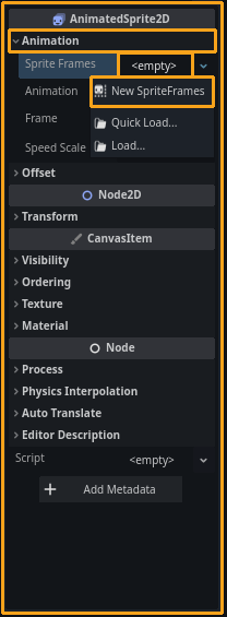 Una vez tengamos nuestra textura, crearemos un nodo AnimatedSprite2D como hijo de nuestro CharacterBody2D. Notaremos que este nuevo nodo no tiene una propiedad de textura como Sprite2D, en cambio, tiene una propiedad llamada Sprite Frames, que se encuentra en la categoría de Animation, daremos click y crearemos un nuevo recurso de SpriteFrames