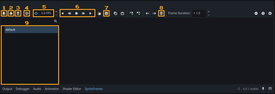 Para nuestra "animación" de Idle, crearemos otra animación (Botón #1), la llamaremos "Idle" y repetiremos el proceso de abrir nuestro Spritesheet (Botón #7), sin embargo esta vez solo seleccionaremos un cuadro. La "animación" de Idle se reproducirá cuando nuestro personaje no este realizando ninguna acción.