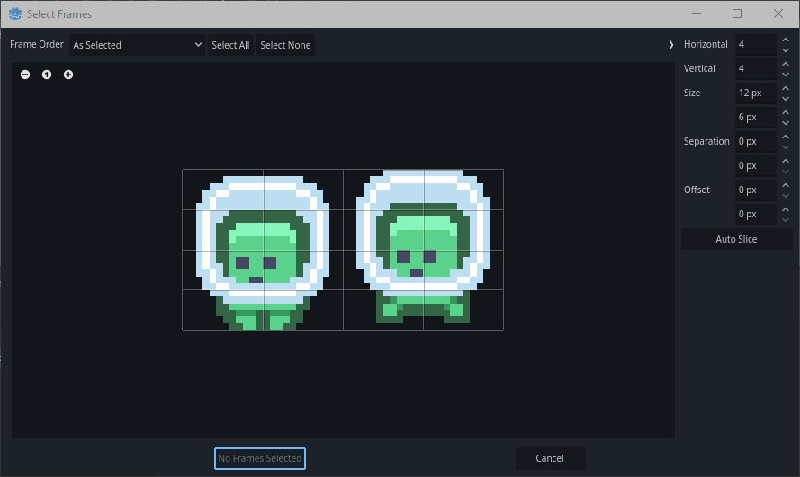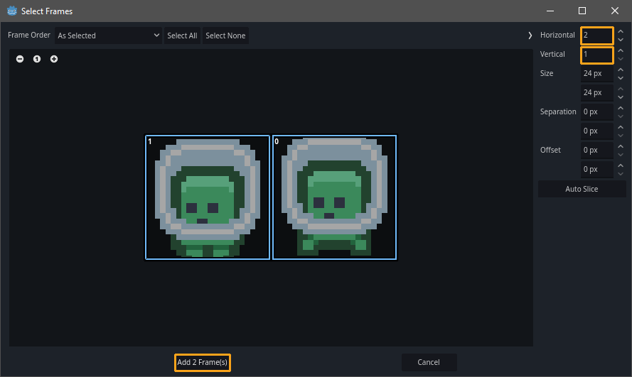 Esta es la ventana de Selección de frames de Spritesheet, y es aquí donde seleccionaremos los frames que usaremos de nuestro Spritesheet. En el apartado derecho de esta ventana podremos ajustar la cantidad de cortes que se le harán a nuestra imagen. En nuestro caso, nuestro Spritesheet solo se compone de 2 cuadros horizontales, entonces ajustaremos la propiedad de Horizontal a 2 recortes, y Vertical a 1.