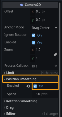 Sin embargo, podemos activar el suavizado de posición encontrado en el panel de propiedades de nodo localizado en la parte derecha del editor, esto hará que nuestra cámara se vea mucha mas fluida al moverse