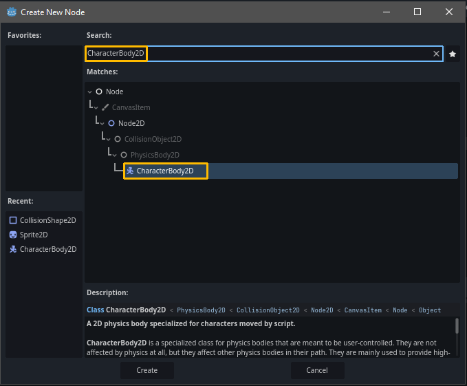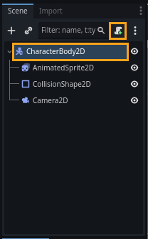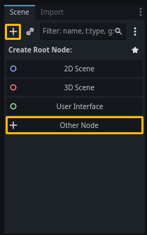 Nuestro personaje sera un nodo de tipo CharacterBody2D, para añadirlo a la escena, tendremos que seleccionar cualquiera de los dos botones subrayados (+, Other Node/Otro nodo), y luego buscaremos CharacterBody2D