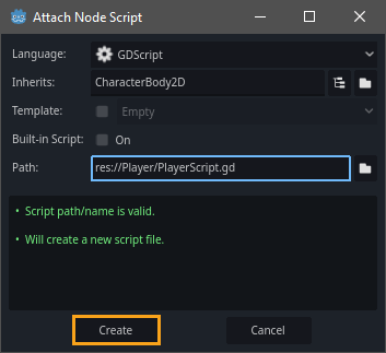 Para crear un nuevo archivo de código y asignarlo a nuestro personaje, presionaremos el botón de añadir Script localizado en la barra superior de nuestro editor de escena, donde se abrirá una nueva ventana de creación de Script, nosotros no necesitaremos un template u otra opción, asi que podemos presionar Create para crear y abrir nuestro código:
