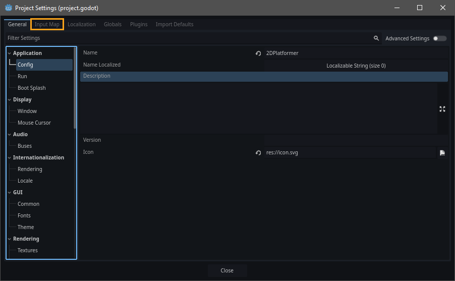 En las configuraciones de proyecto, buscaremos la categoría de Input map/Mapa de entrada