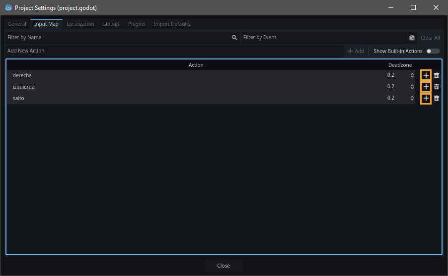 Por cada acción, asignaremos una tecla, para asignarla presionaremos el botón de +, y pulsaremos una tecla de nuestro teclado, escoge la que tu prefieras para dicha acción.
