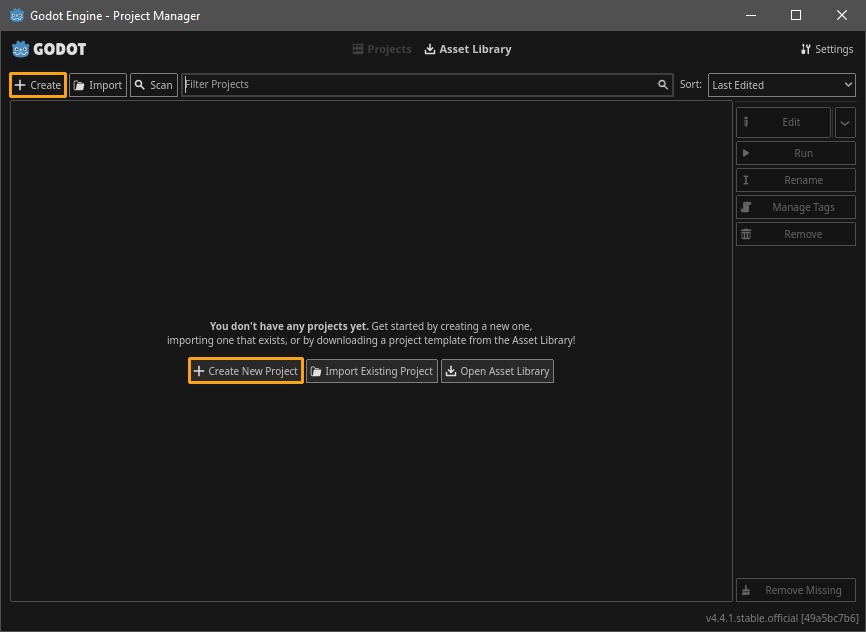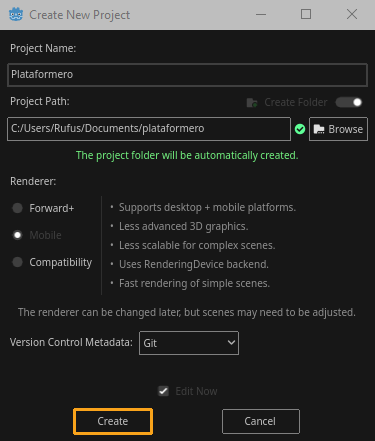 Para empezar, necesitamos crear nuestro proyecto en Godot. Los proyectos en Godot se representan mediante carpetas, estas carpetas deben de tener el mismo nombre de nuestro proyecto, y todo asset de nuestro juego ira dentro de esta carpeta. Ponle un nombre a tu proyecto y presiona crear para empezar a editarlo.