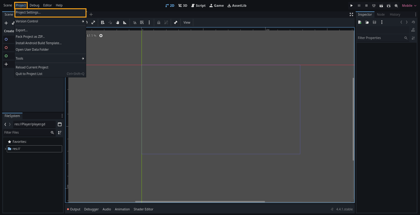 Para definir esta resolución en nuestro proyecto, buscaremos en la barra superior del editor la sección de Project, desplegamos el menu, y dentro de este presionaremos el primer botón Project settings.