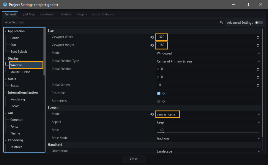 Al presionar este botón, se abrirá la configuración del proyecto en una nueva ventana. Aquí buscaremos la opción de Window/Ventana dentro de la categoría Display, donde podremos modificar todo lo relacionado con la ventana de nuestro juego. Aquí podremos especificar el ancho y largo de nuestra ventana, que por defecto sera el tamaño de nuestra pantalla, aquí especificaremos la resolución de 320 de ancho/width por 180 de alto/height.