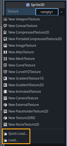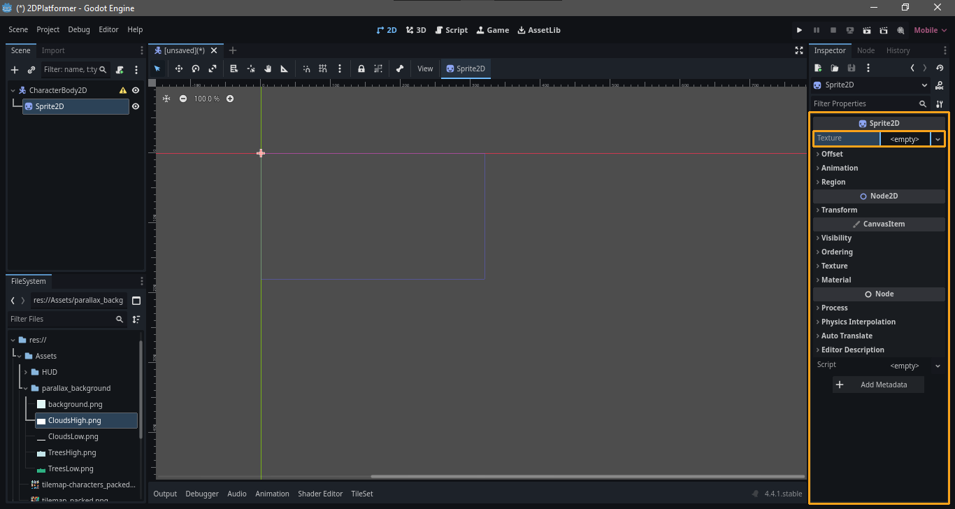 Para mostrar a nuestro personaje con una imagen estática, crearemos un Sprite2D como hijo del CharacterBody2D. Para que podamos ver nuestro Sprite, tendremos que asignar una textura a la propiedad de Texture/Textura, localizada en el apartado de propiedades de nodo en la parte derecha del editor.