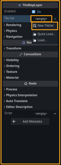 Una vez creado nuestro nodo TileMapLayer, buscaremos por la propiedad Tileset en la sección de propiedades del nodo (recuerda, se encuentra en la parte derecha del editor) y crearemos un nuevo recurso de Tileset.