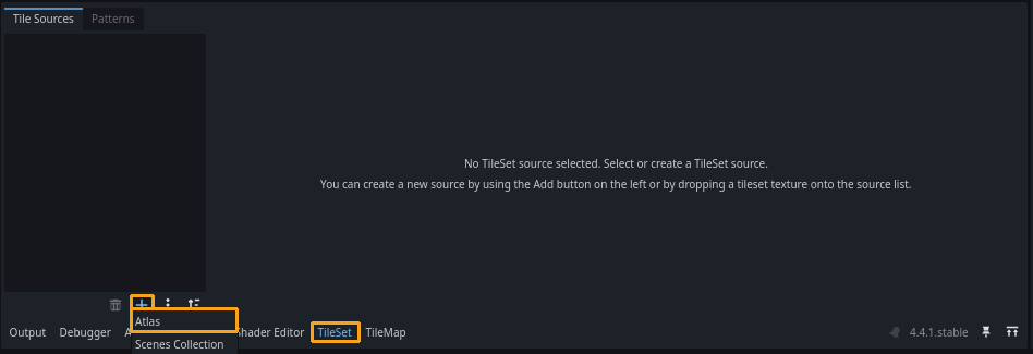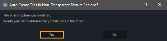 Ya especificado el tamaño de nuestros tiles, podemos añadir nuestra textura en la sección de Tileset añadiendo un nuevo Atlas. Al cargarla, nos aparecerá un aviso donde nos preguntara si queremos crear automáticamente los tiles a partir de la textura, y responderemos Yes.