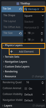 Iremos nuevamente a la sección de propiedades del Tileset de nuestro nodo TileMapLayer y buscaremos por la propiedad Physics Layer, y crearemos una capa de físicas para nuestros tiles.