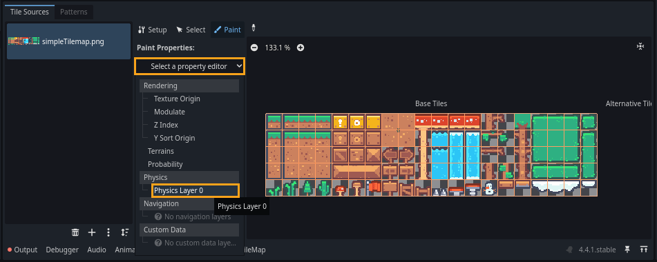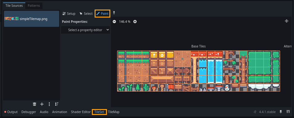 Una vez creada nuestra capa de físicas, tendremos que aplicarla a nuestros tiles. Para hacer esto, iremos al apartado de Tileset en la parte inferior del editor, y seleccionaremos el modo de Paint para "pintar" atributos sobre nuestros tiles.