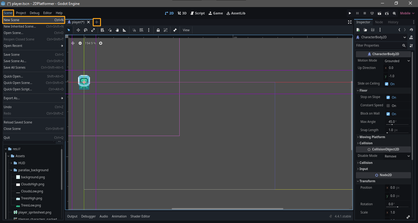 Para empezar a crear nuestro nivel, debemos de crear otra escena. Hay varias maneras de realizar esto, por ejemplo, podemos usar el atajo de teclado Ctrl+n, o bien podemos crearla desde la interfaz del editor con el botón + al lado de nuestra pestaña de personaje (esta interfaz es similar a la de un navegador Web!) o desde el menu de Scene localizado en la parte superior izquierda del editor