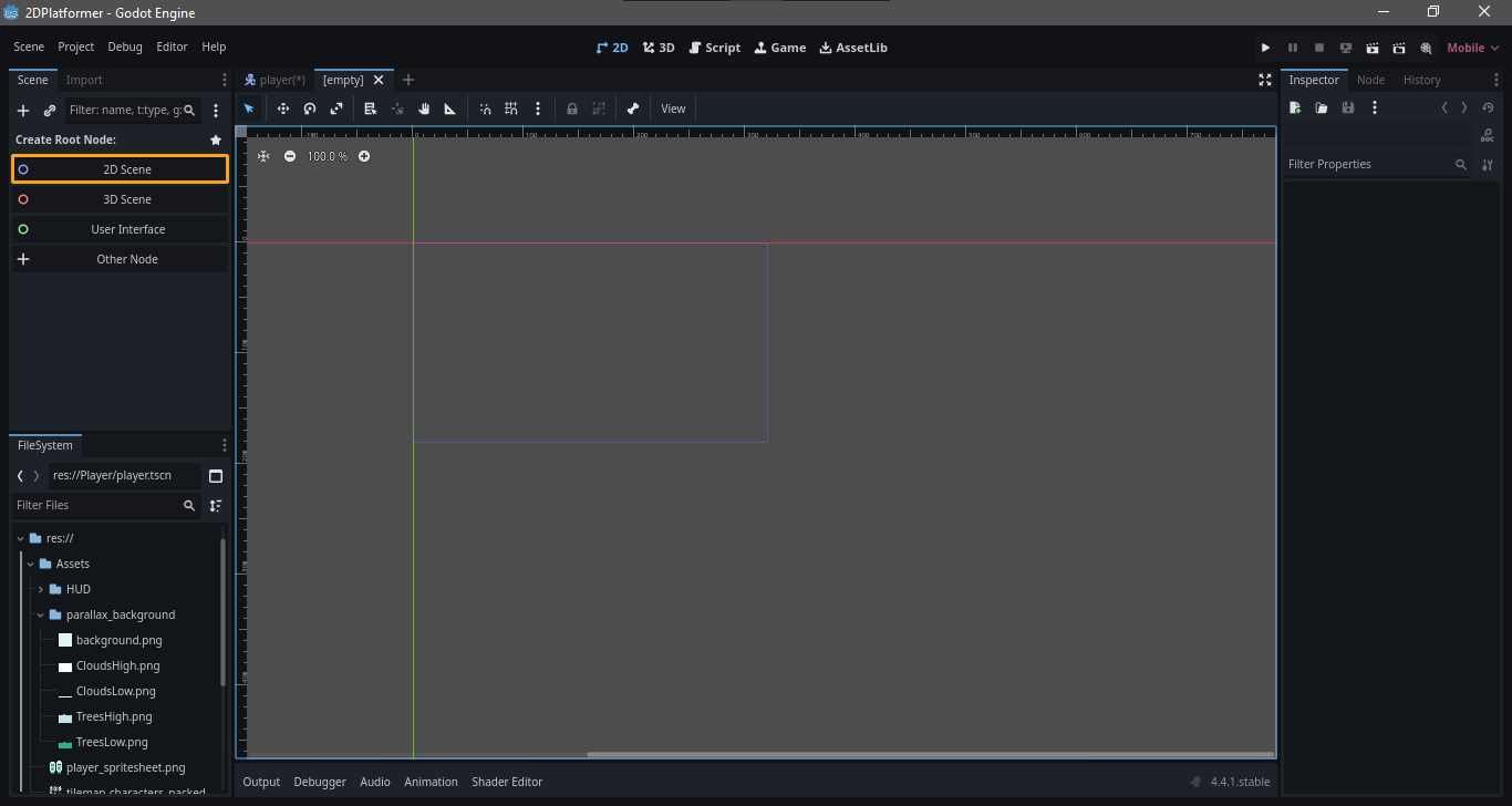 Al crear nuestra nueva escena, veremos que esta vacía, necesitaremos añadir un nodo de tipo Node2D. Es aquí donde añadiremos todo el contenido de nuestro nivel, y eventualmente, a nuestro personaje.